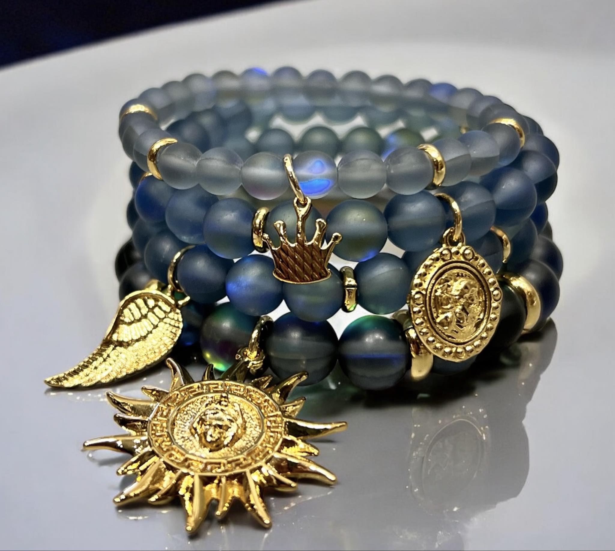 Bransoletka składa się z 4 osobnych bransoletek co pozwala na dowolną stylizację, na każdej znajduję się przywieszka. Kamienie naturalne.