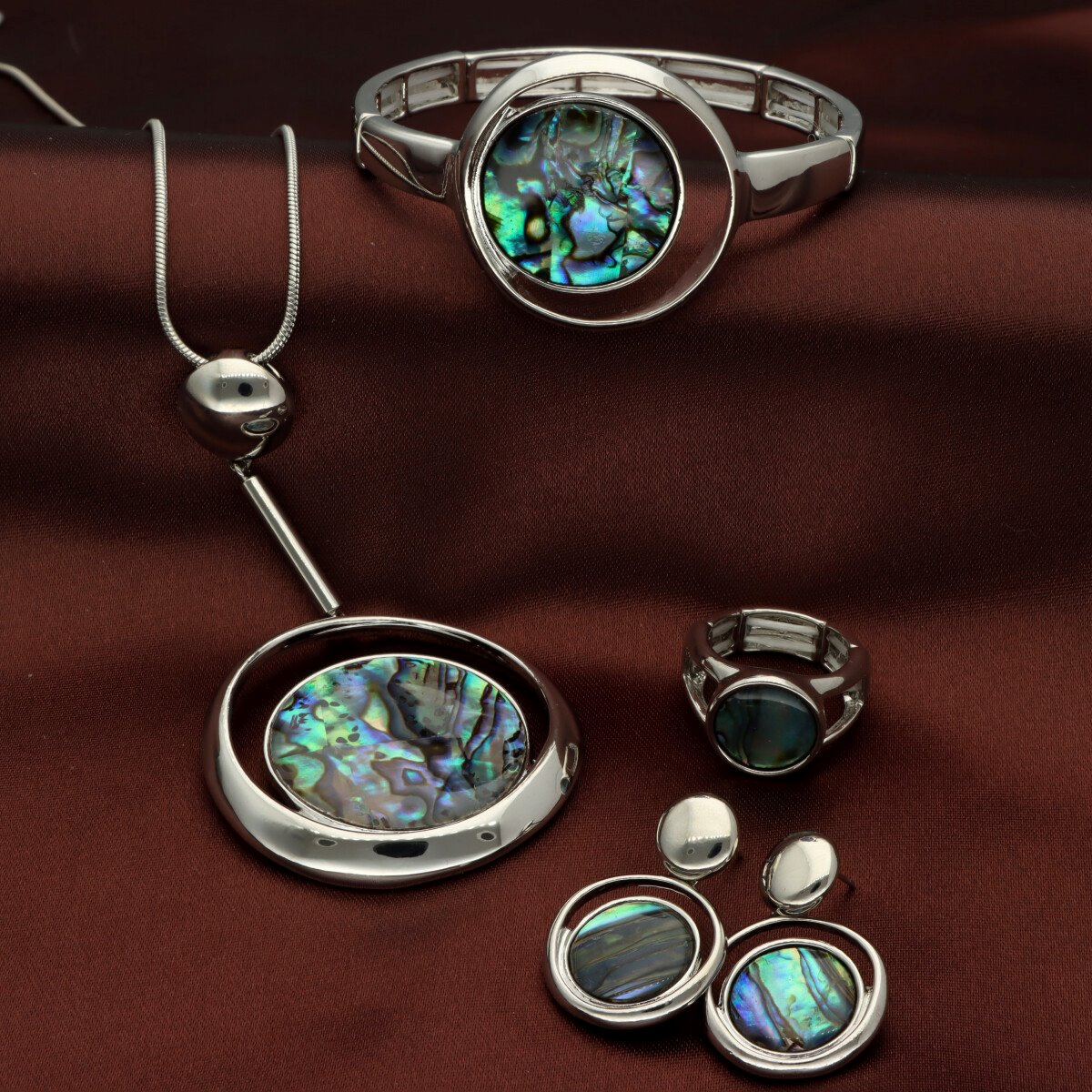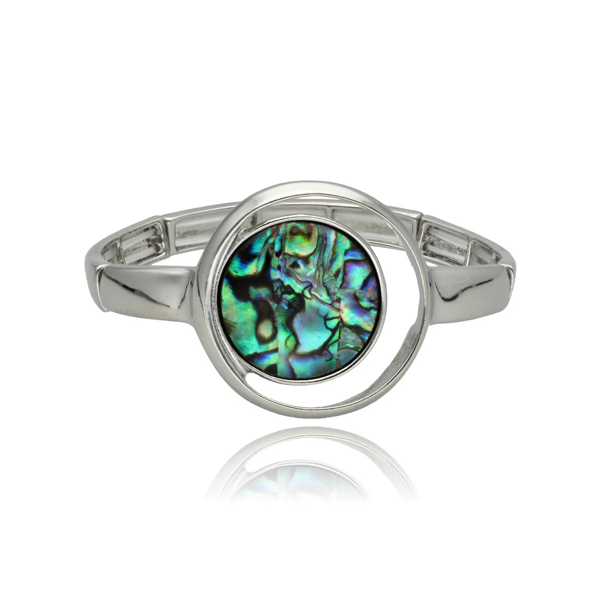 Stylowa bransoletka na elastycznej gumce, wykonana z metalowych, antyalergicznych elementów i muszli naturalnej Abalone. Bransoletka dopasowuje się do nadgarstka, zapewniając komfort noszenia.