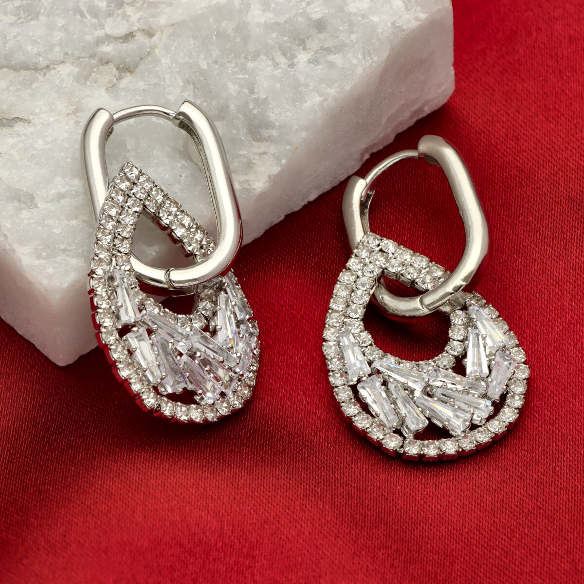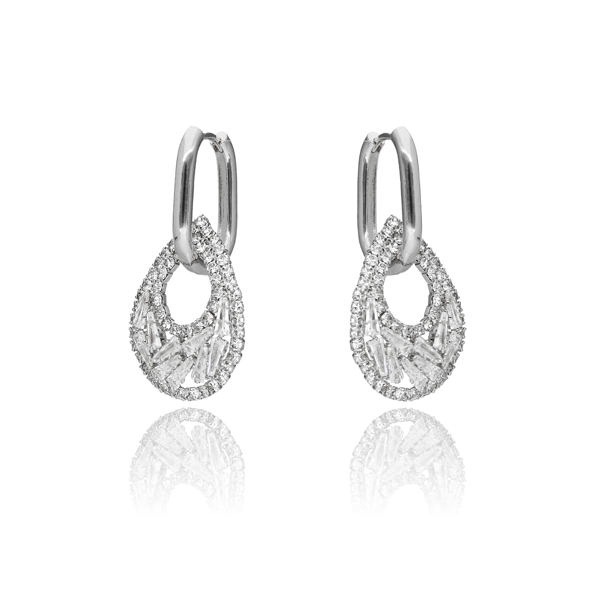 Wyjątkowe kolczyki wykonane z hipoalergicznego metalu na bazie mosiądzu, ozdobione wysokiej jakości cyrkoniami, które pięknie odbijają światło i nadają biżuterii eleganckiego blasku.